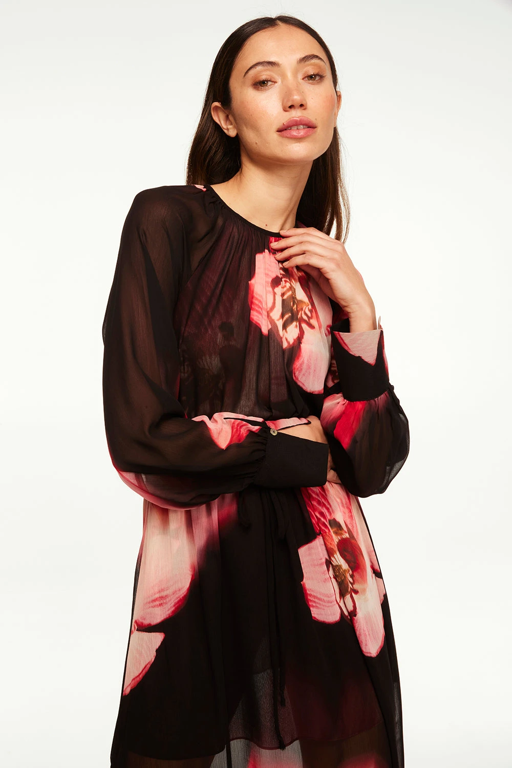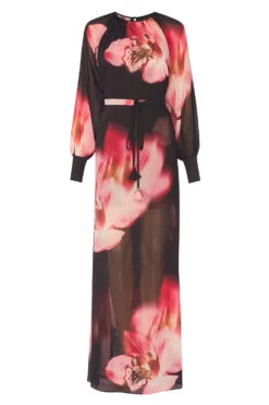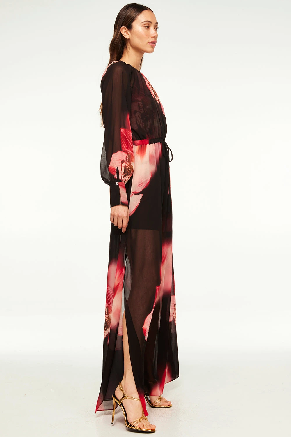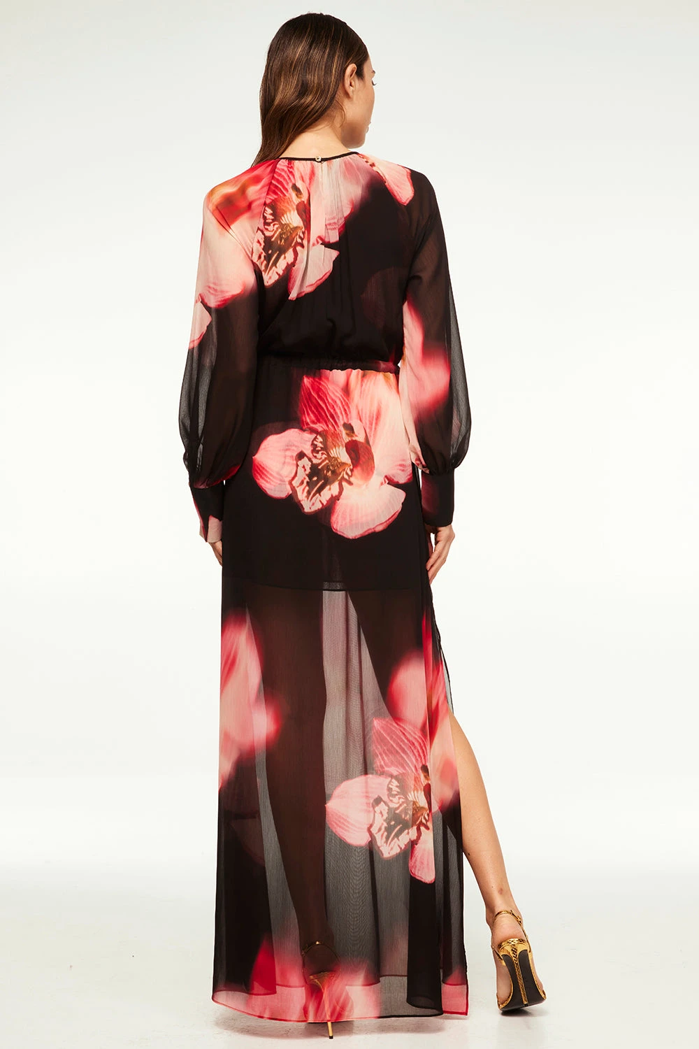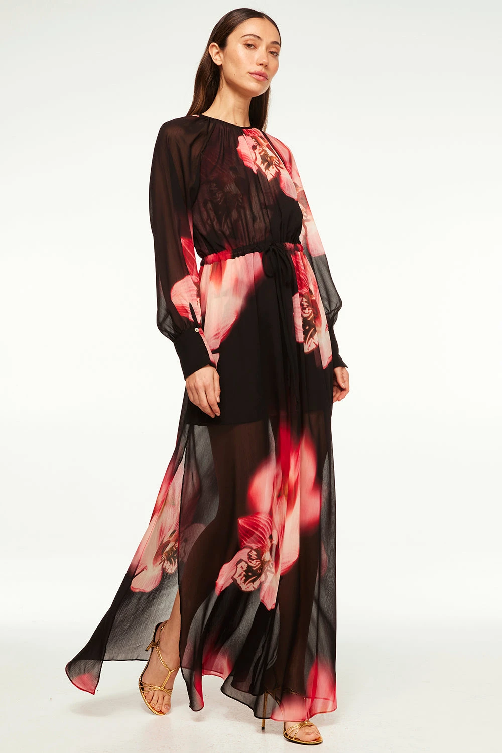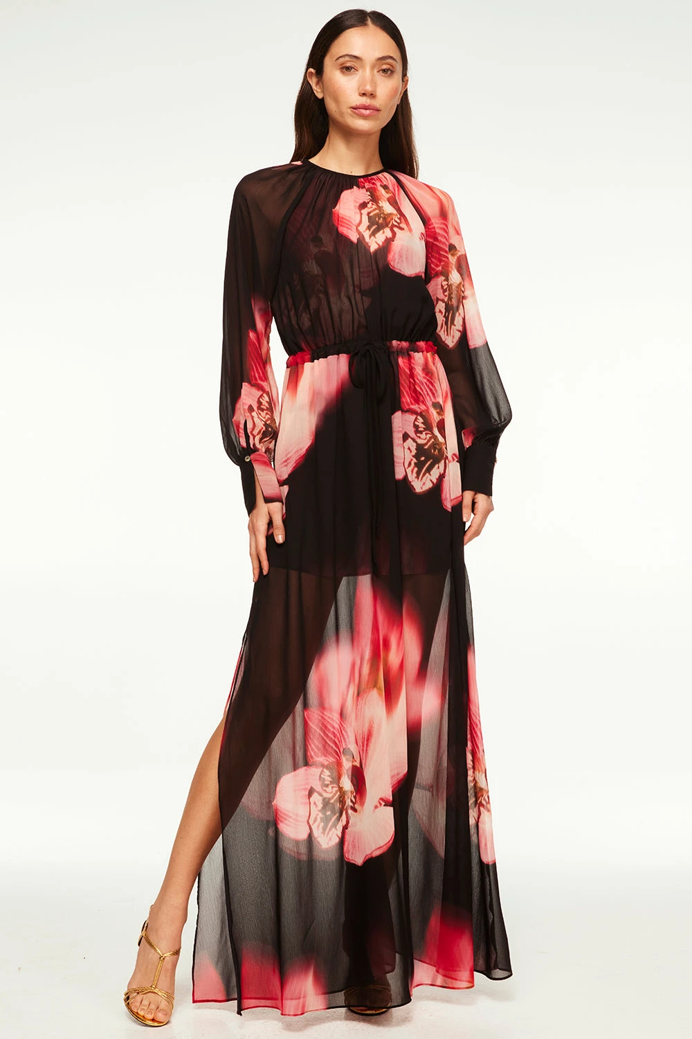 Our Midnight Orchid graphic printed Naomi dress in chiffon is the epitome of bohemian chic. A high neckline with back summary closure and blouson sleeves with wide single summary cuffs. A flowing maxi length skirt features an adjustable cinch tie waist and side slit. Fully lined. The bodice and lower hem are semi sheer. Pair this with everything from a chic over-the-knee suede boot to heels.