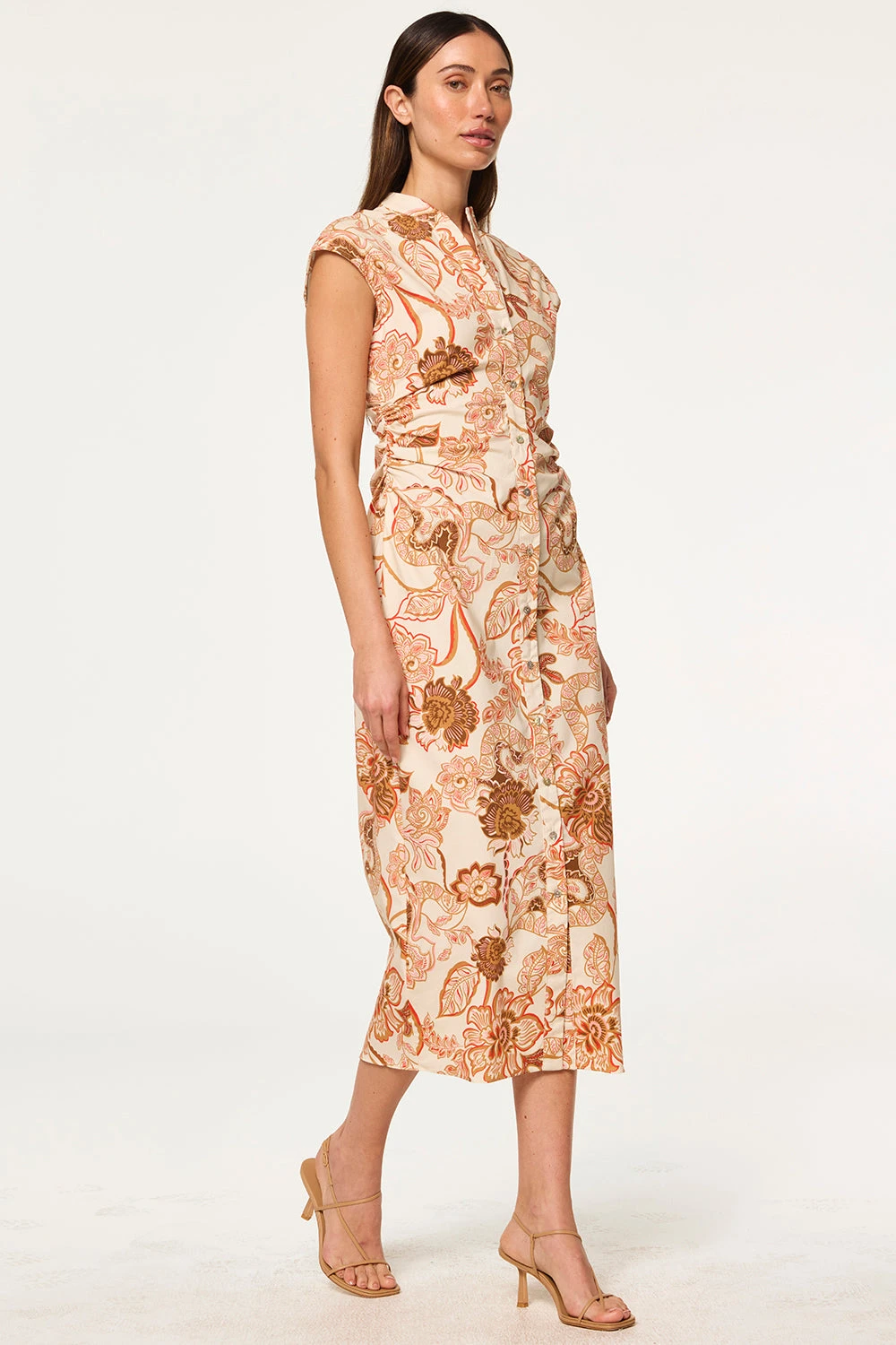 The Niara dress is an all-new midi silhouette perfect for the late summer to early fall transition. Cut in a Summer Batik printed stretch cotton poplin, it’s designed sleeveless with a full summary front and a high neckline with a subtle V. A ruched waist creates a flattering fit that’s both effortless and refined.