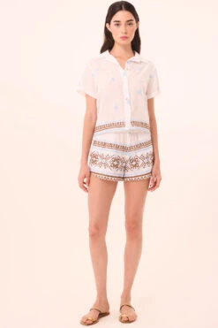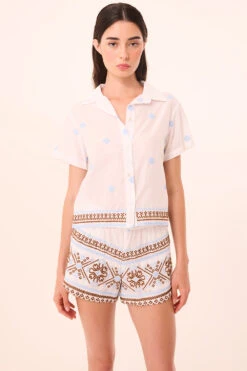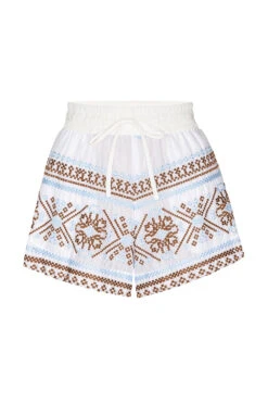 The Noah short is an easy pull-on style cut from crisp white cotton, accented with light blue and chocolate embroidery. Designed with a ruched elastic waistband and adjustable drawstring, it features a slightly curved hem and side slit pockets for added ease. Pair with the coordinating Magda or Jasmin top for a laid-back summer set—perfect for poolside lounging or warm weekends away.