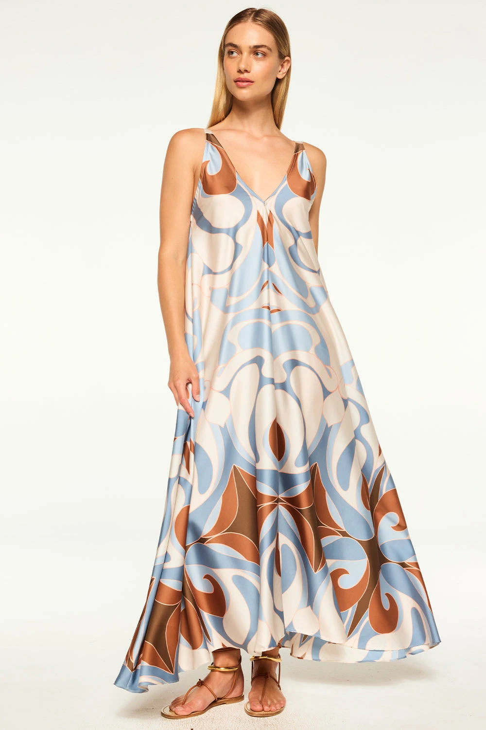 The Notta dress is back in a gorgeous graphic Swans printed satin. A simple flowing maxi silhouette is the perfect showcase for this stunning print, featuring a v-neckline and v-back. Slipover style. Pair with strappy sandals for the perfect look.