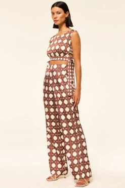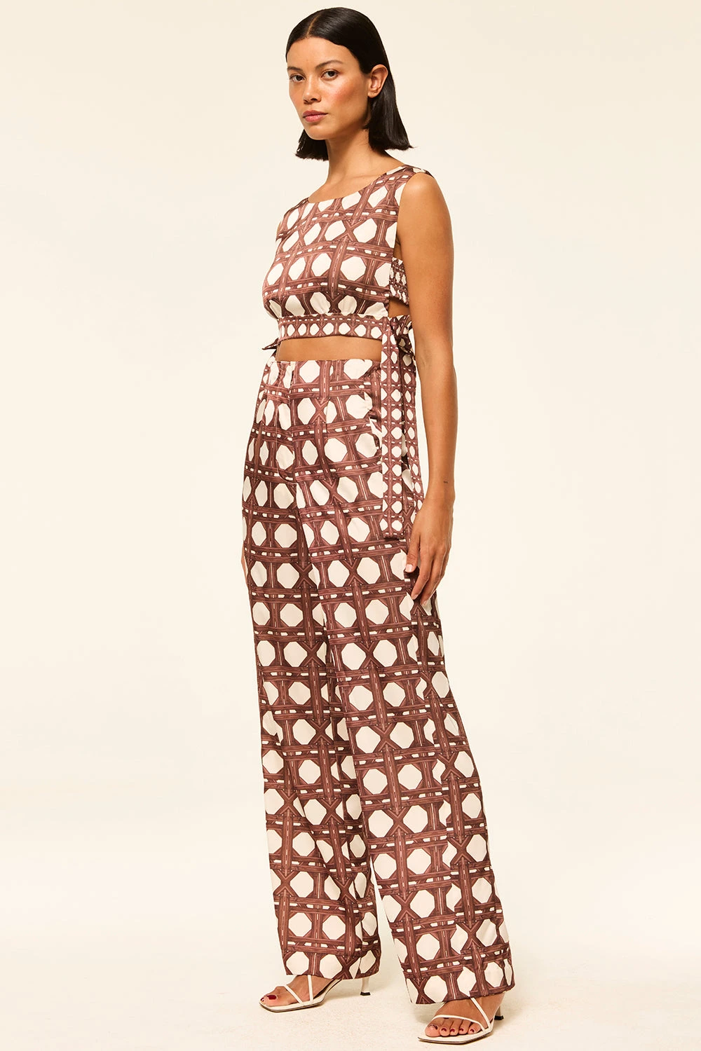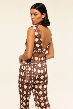 Olena is a standout piece from our Spring collection. This tailored crop top is cut from gorgeous Chocolate Rattan print satin and features a high neckline and v back. Side cutout with a smocked stretch band. Trimmed with a smaller scale print and bow details with hidden summary closure. Pair with the coordinating Rita pant for a memorable spring set for your next soirée.