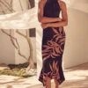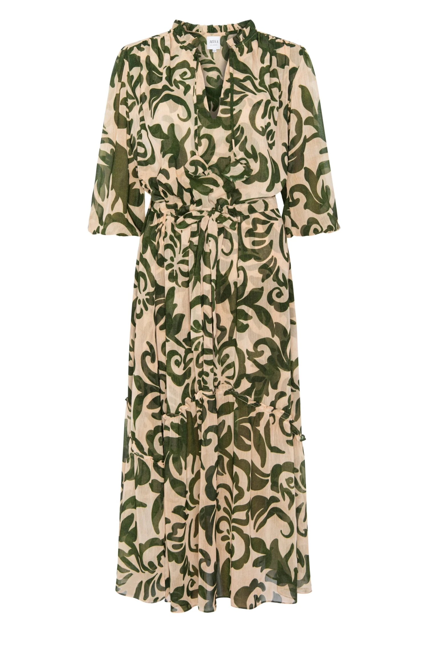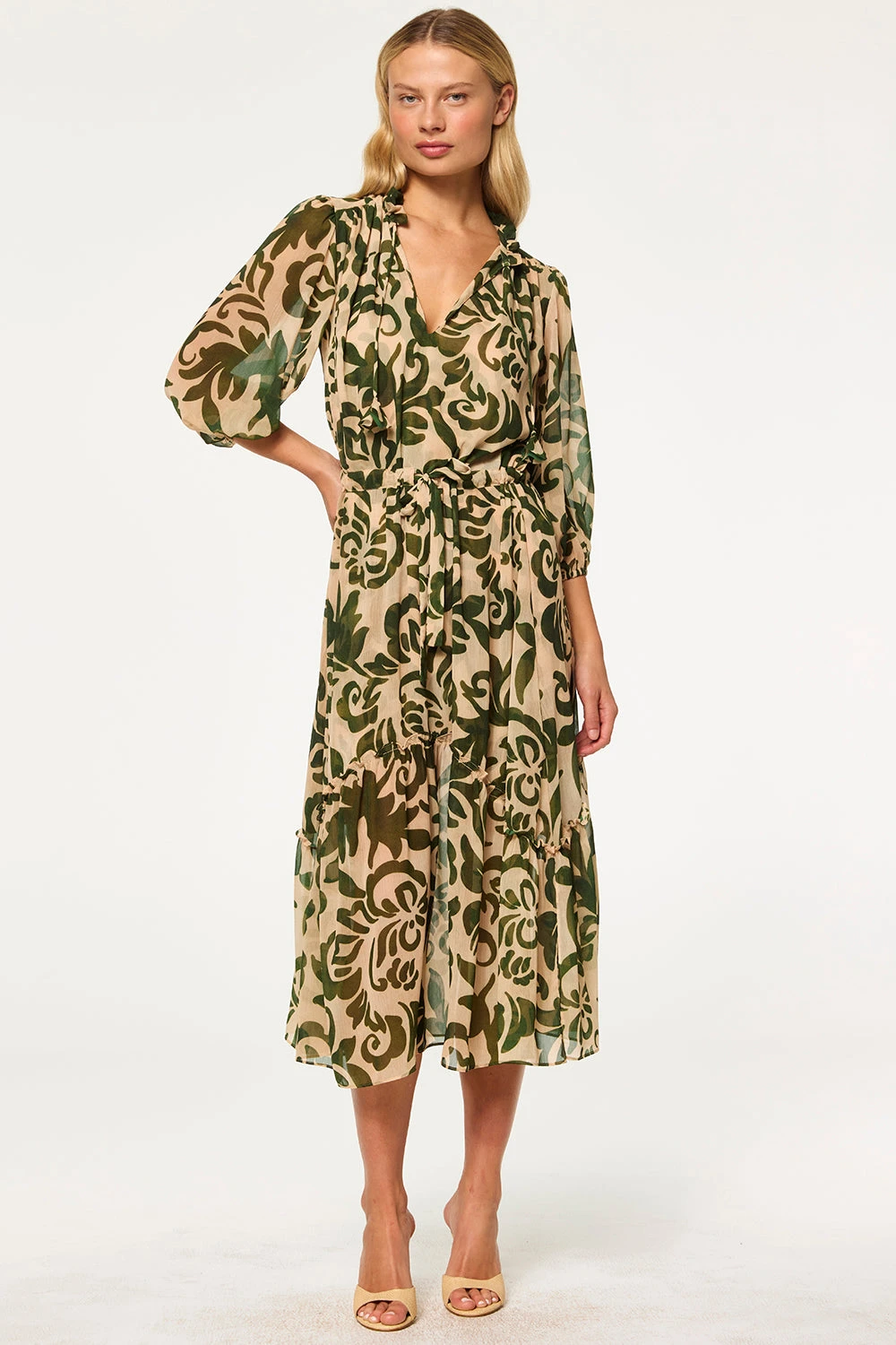 Olivia is an effortlessly feminine midi silhouette. Cut from Tonal Cactus printed chiffon, this chic dress features an adjustable tie-waist, semi-sheer three-quarter blouson sleeves and an open neckline finished with our signature string petal ties.