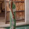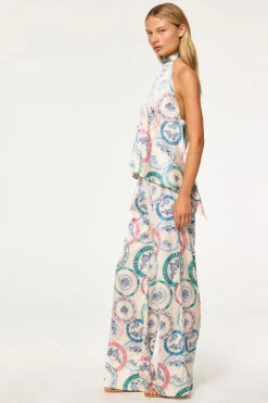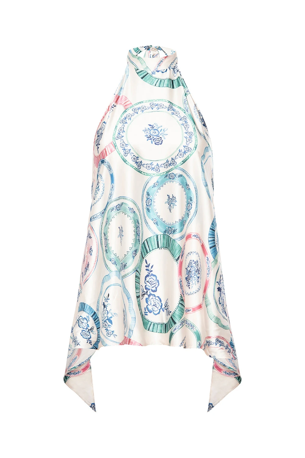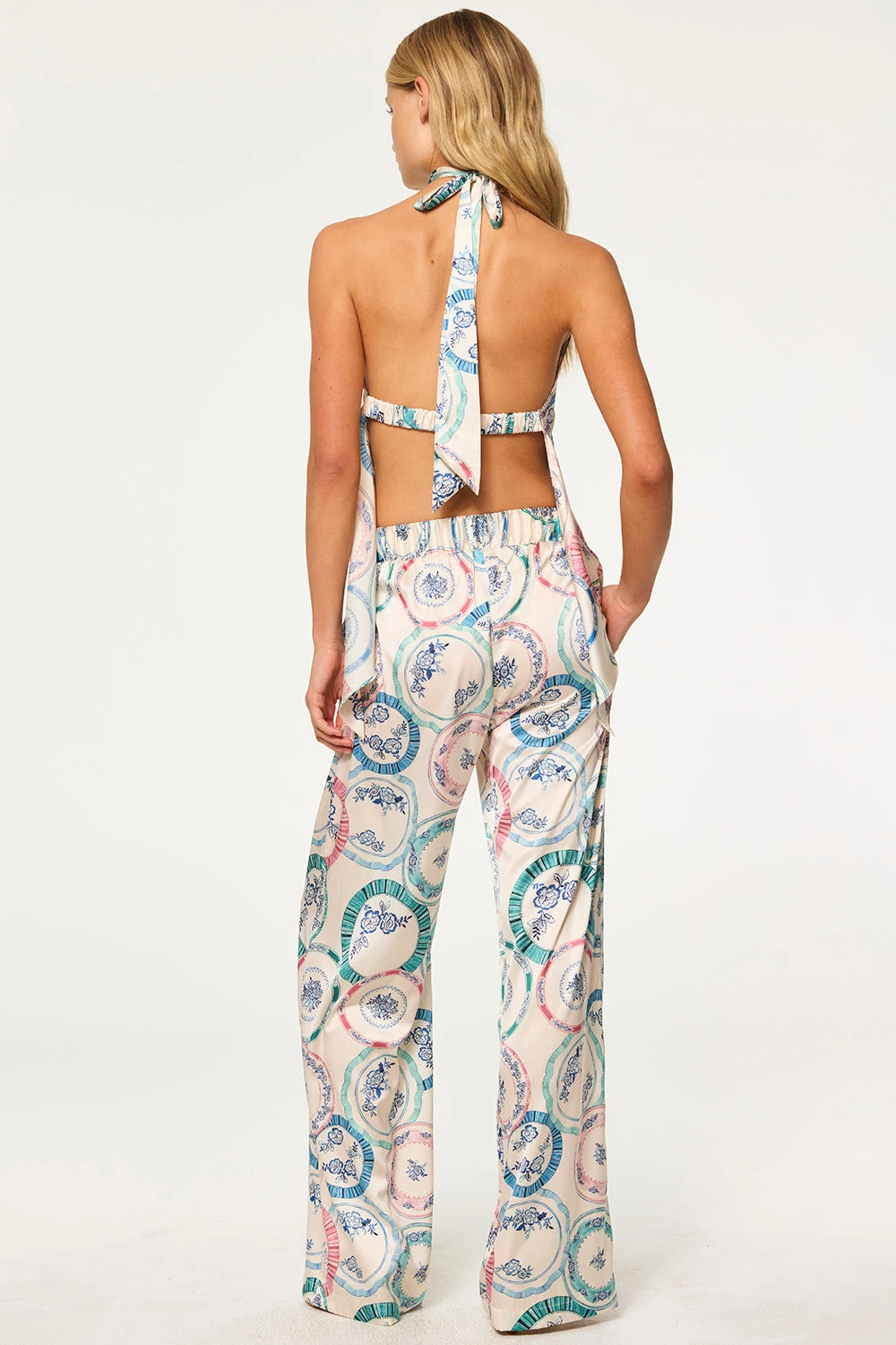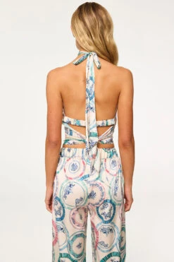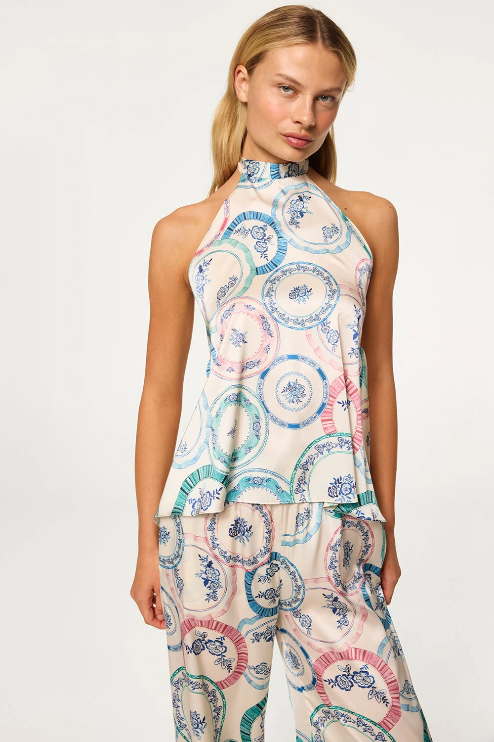 Ora is an asymmetric halter-style scarf top cut from our Prismatic Plates–motif satin. This effortless silhouette features a double tie-back and an elasticized band for a secure fit, allowing it to be worn loose and open with ease. Pair it with the coordinating Reshma Pant for a chic, modern summer set.
