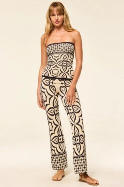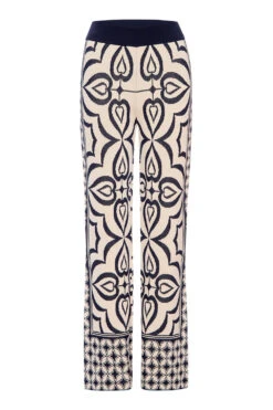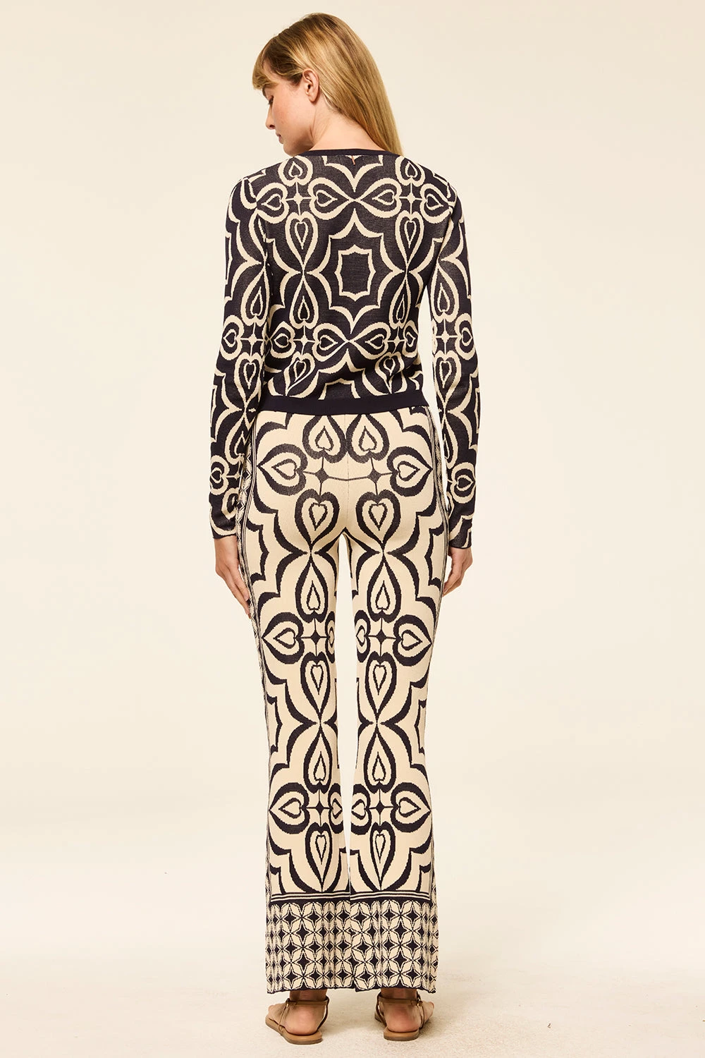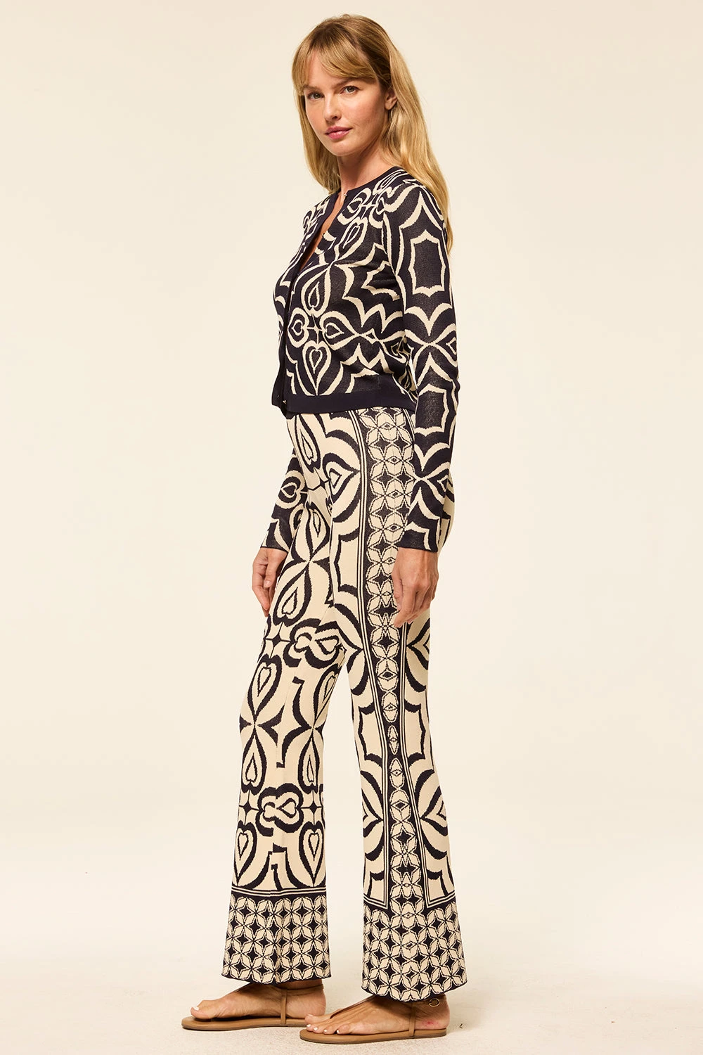 Orla is a flattering stretch knit jacquard pant in a navy mosaic tile print. This slightly flared, fitted style features a solid ribbed knit waistband for a flattering fit. Pull-on style. Pair with the coordinating Nessa bandeau and Pansy cardigan for a spring-ready three-piece set.