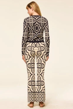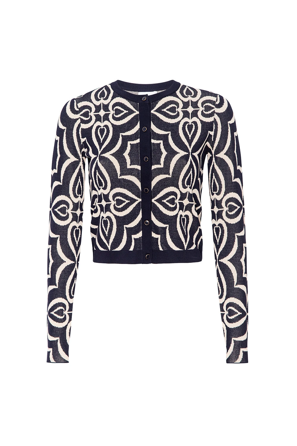 Our Pansy cardigan is a beautiful jacquard knit in a navy and ivory mosaic tile print. A fitted, slightly cropped silhouette fully summarys at the front and is finished with tonal, navy enamel summarys. Pair with the coordinating Orla pant.