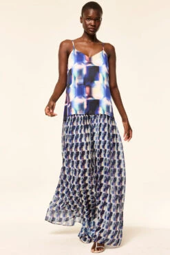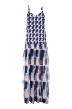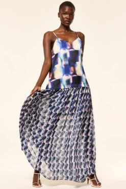 Our Pauline dress is a maxi length drop waist silhouette in contrasting satin and chiffon. Rendered in modern Amethyst Geo print, a satin bodice features a v neckline with adjustable spaghetti straps that leads into a lined flowing skirt in chiffon. Pair with strappy heels for a head-turning look at your next event.