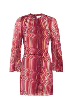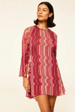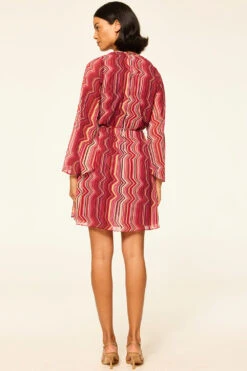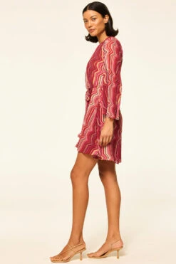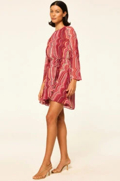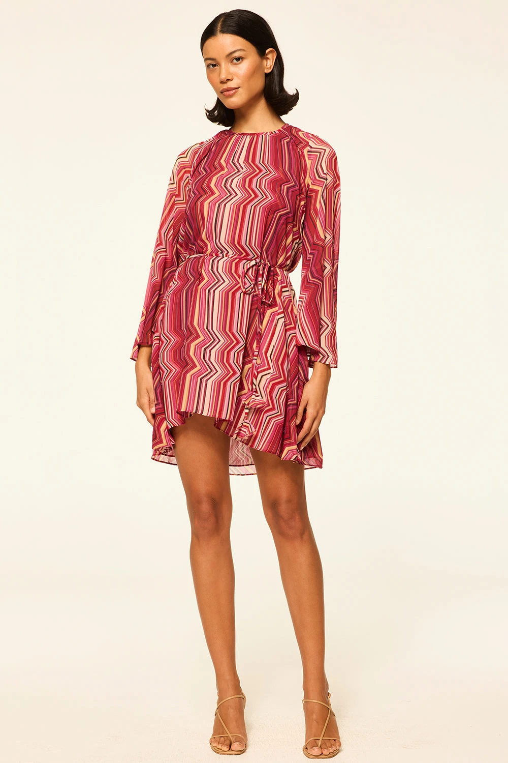 Evoke effortless confidence in our gorgeous new Petra dress cut from a striking La Banda Crimson printed chiffon. Defined by flowing semi-sheer bell sleeves and dramatic back keyhole with summary enclosure. A removable self-tie waist leads into a double-lined asymmetric mini skirt.