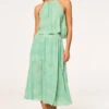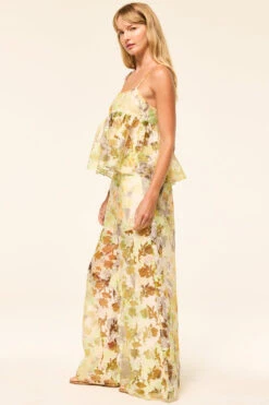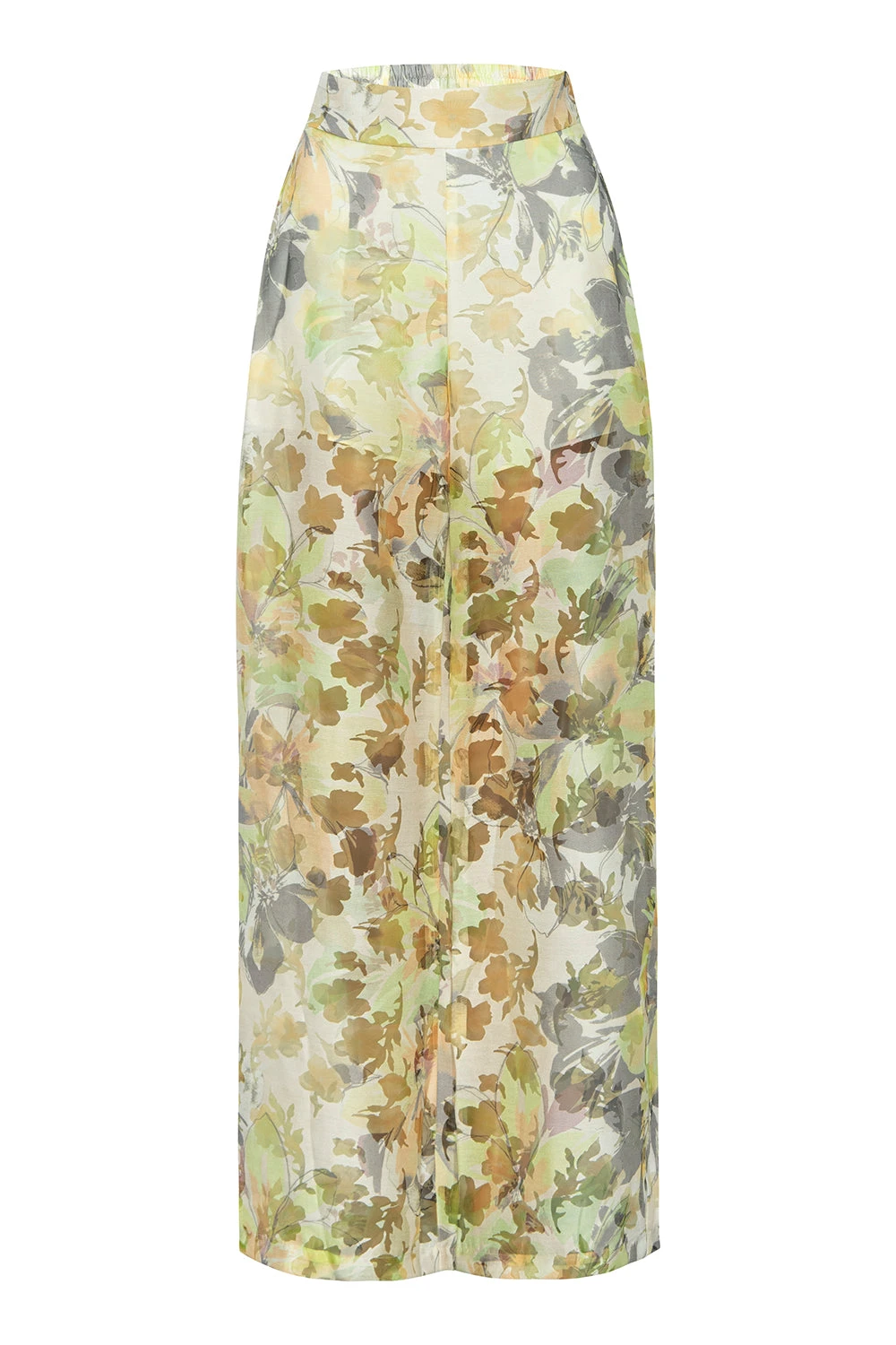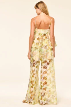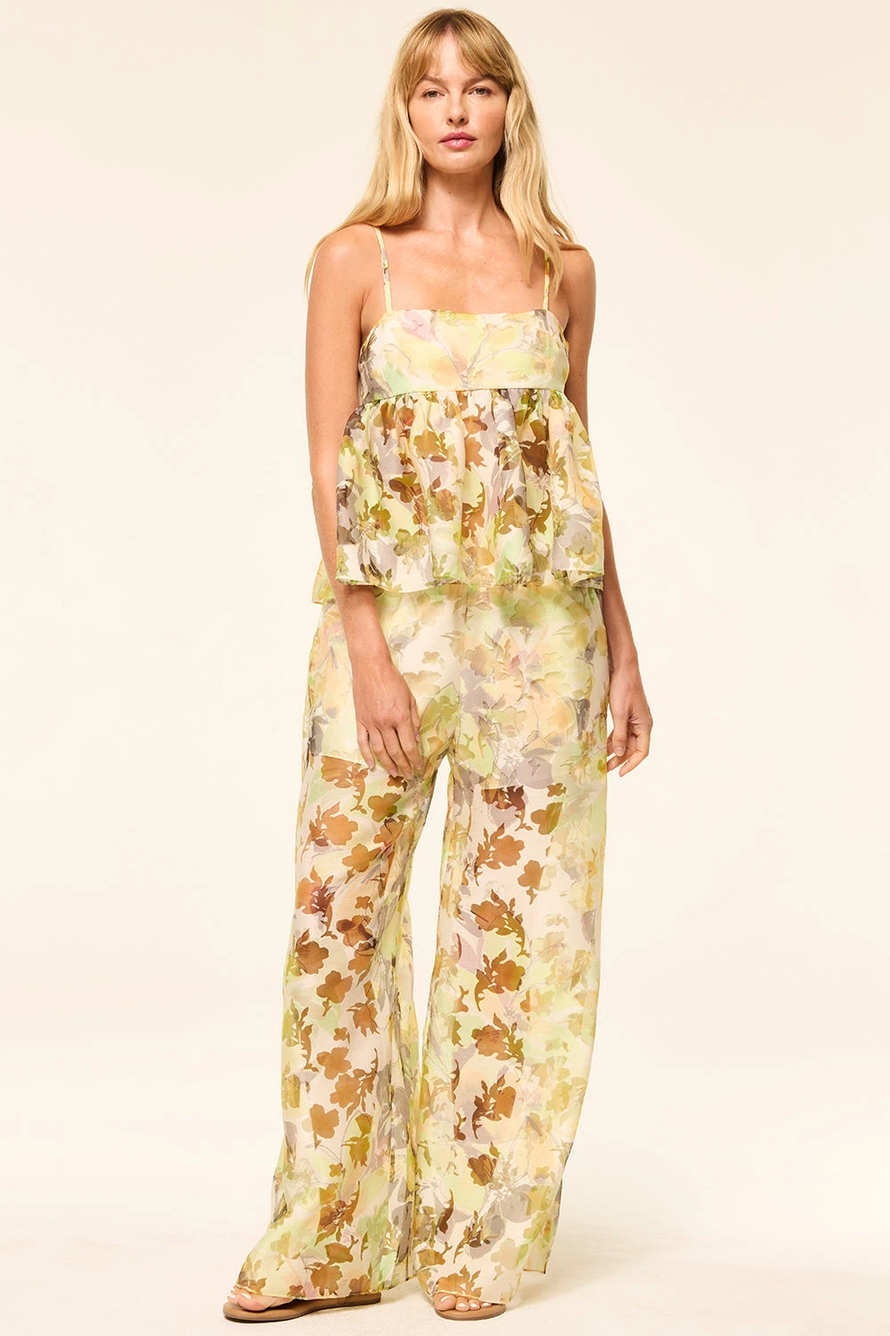 Our Pia pant is a chic new spring style cut from a sheer burnout Lucent Blooms print. These wide-leg pants feature a covered elastic waistband and double side slit pockets. Partially lined to the mid-thigh. Complete the set with the coordinating Trista top.