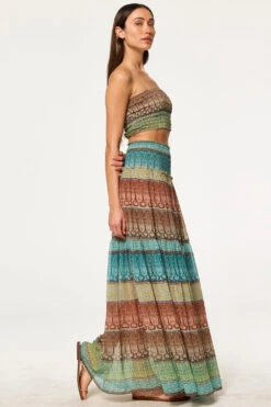 The Polly skirt is an effortless maxi silhouette cut from our vibrant Paisley Ombré–printed chiffon. Designed with a wide smocked elastic waistband, it flows into a relaxed skirt with a front slit that starts above the knee. Pair it with the coordinating Roksana bandeau for the perfect summer set—ideal for vacations, beachside escapes, and poolside lounging.
