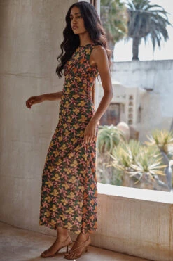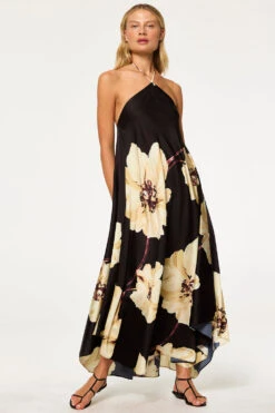 Raban is a striking ankle-grazing halter dress cut from our Golden Poppy printed satin with a black ground. Fitted at the bust and flowing through the skirt, this silhouette features a staggered handkerchief hem for added movement. The halter neckline ties at the back above an elasticated open back. A versatile style—perfect dressed up for events or worn with flats for an elevated daytime look.