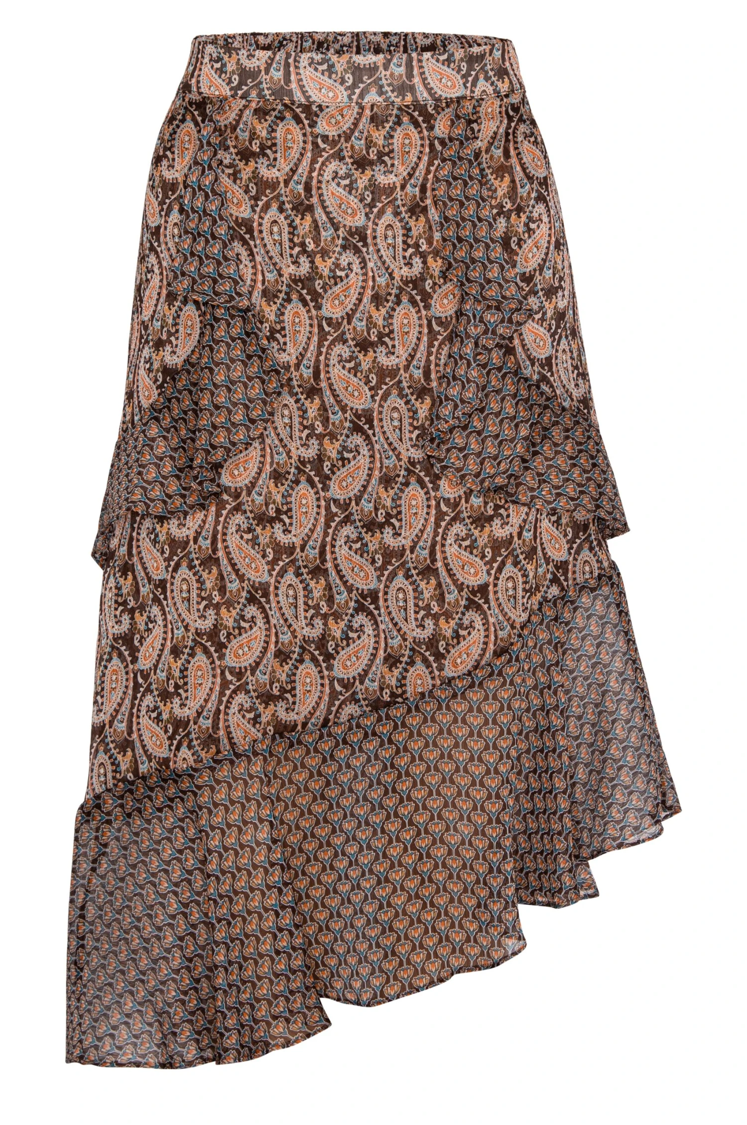 Rakal skirt is a midi-length asymmetrical skirt cut from our brown paisley chiffon. A larger paisley print is offset by a contrasting small floral print at the wide ruffle hem. Fitted to the mini length and double lined through the body, it flows into a wide sheer ruffle that cuts across diagonally for beautiful movement. Additional ruffle details in the same smaller floral adorn the front and back. Finished with a banded waist and an elasticated back for a comfortable fit. Pair it with the Maris top for a complete, bohemian-inspired set.