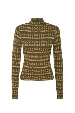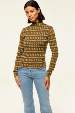 Our new River top is a rib knit jacquard fitted turtleneck in an Olive Geo print. Featuring long sleeves and a keyhole back summary closure. Pair with jeans or the coordinating Milani skirt.