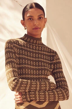 Our new River top is a rib knit jacquard fitted turtleneck in an Olive Geo print. Featuring long sleeves and a keyhole back summary closure. Pair with jeans or the coordinating Milani skirt.