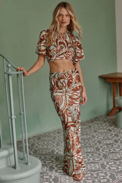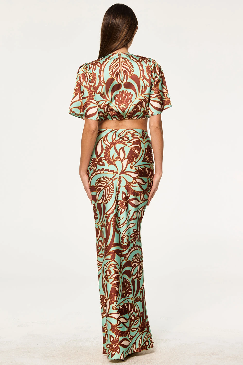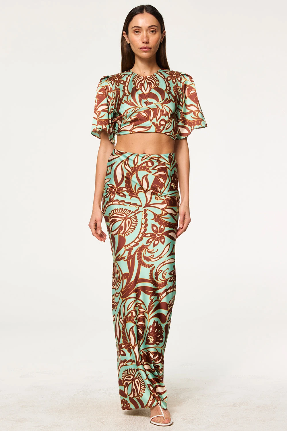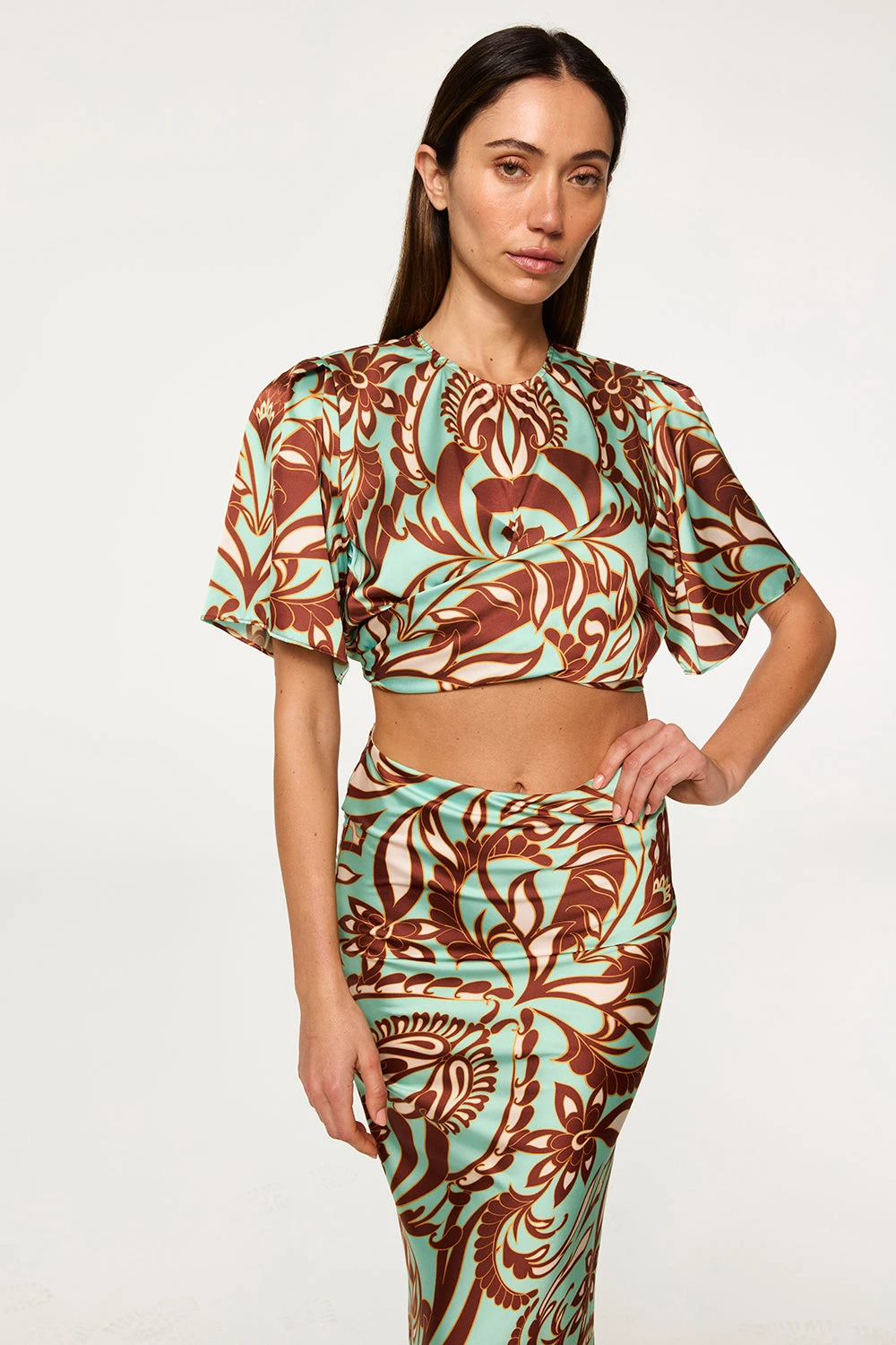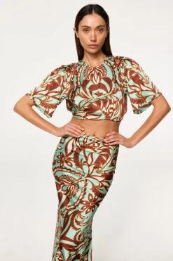 The Roni top is a chic new cropped silhouette cut from our Brown Vintage Botanical printed satin on a striking mint ground. Designed with a high neckline, short wide sleeves, and a flattering twist-front detail, it features an elasticated back and keyhole summary closure for a comfortable fit. Pair with the coordinating Sierra skirt for a head-turning summer event look.