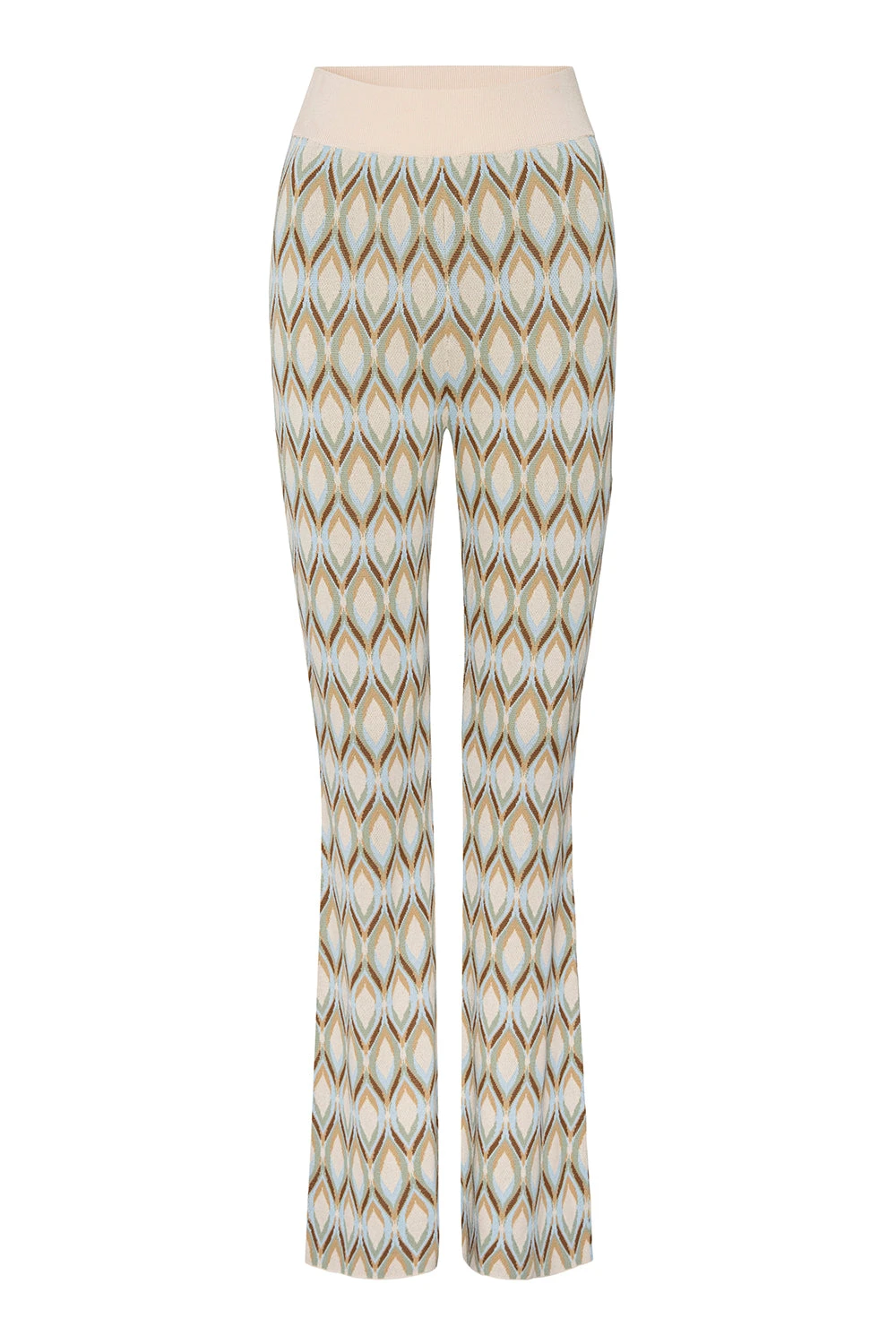 Roura is a flattering stretch knit jacquard pant in a chic cream print. This slightly flared fitted style features a solid ribbed knit waistband for a flattering fit. Pull-on style. Pair with the coordinating Leah top and Joyce top for the perfect set.