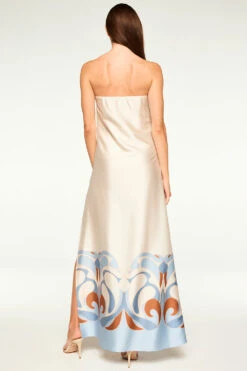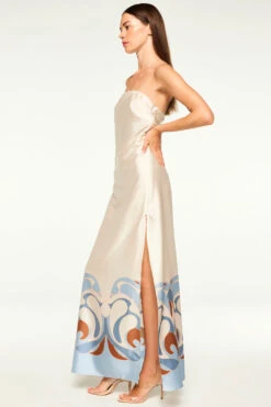 Sabina is a simple, strapless column dress cut from ivory satin with our graphic Swans print border. This maxi silhouette features a hidden side zip closure and slit at the mid-thigh. Wear alone or even over the coordinating Isara pant.
