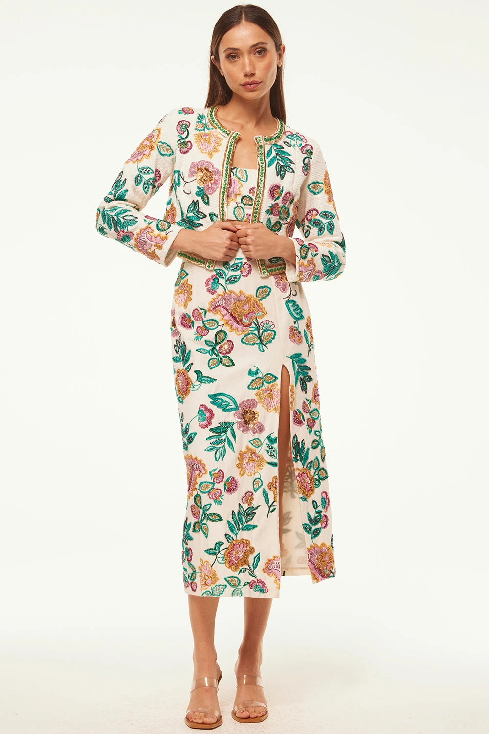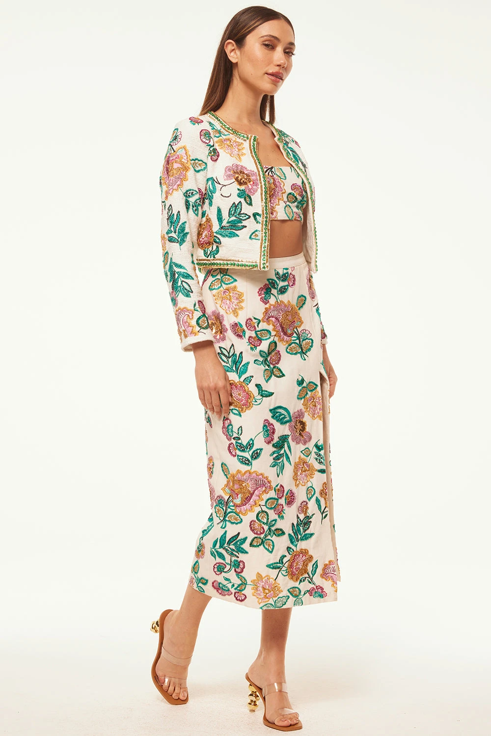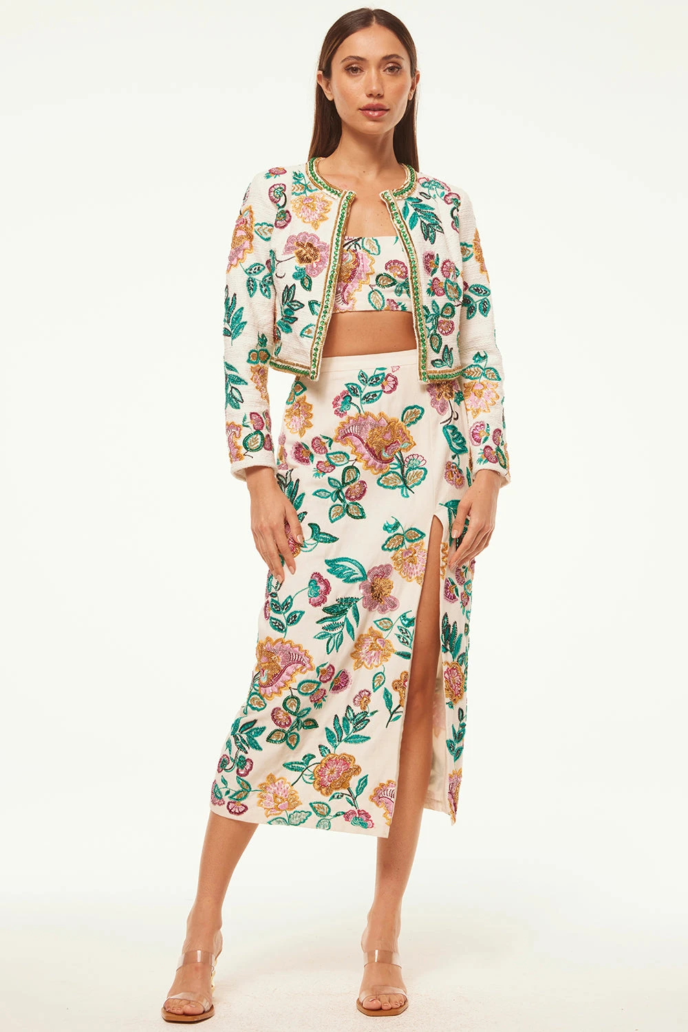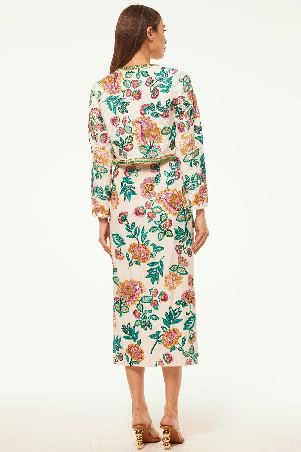 Our Salima jacket is an heirloom piece you’ll wear for years to come. This gorgeous cropped jacket features intricate hand beaded florals and paisley across a cream fabric ground. Hidden hook and eye closures and a high neckline finish off this special piece. Pair with the coordinating Driss top and Thema skirt for a memorable, head-turning look.