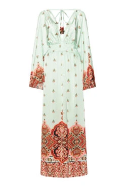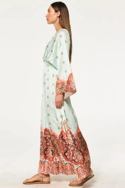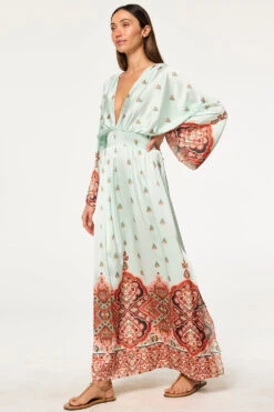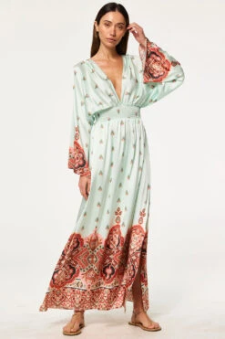 The Sloane dress is a standout maxi silhouette cut from our gorgeous Bohemian Border print satin in fresh mint. Designed with wide, long kimono-style sleeves and gathered shoulders, it features a deep V-neckline and a comfortable smocked waist. An open back ties at the neckline, while double side slits add fluid movement. A pull-on style that’s effortlessly chic—perfect to dress up or down for any occasion.