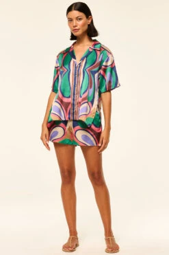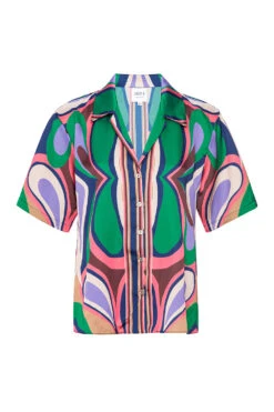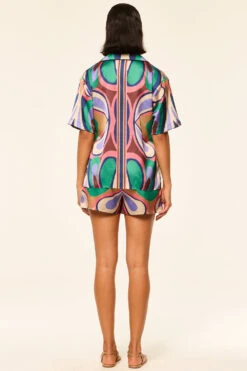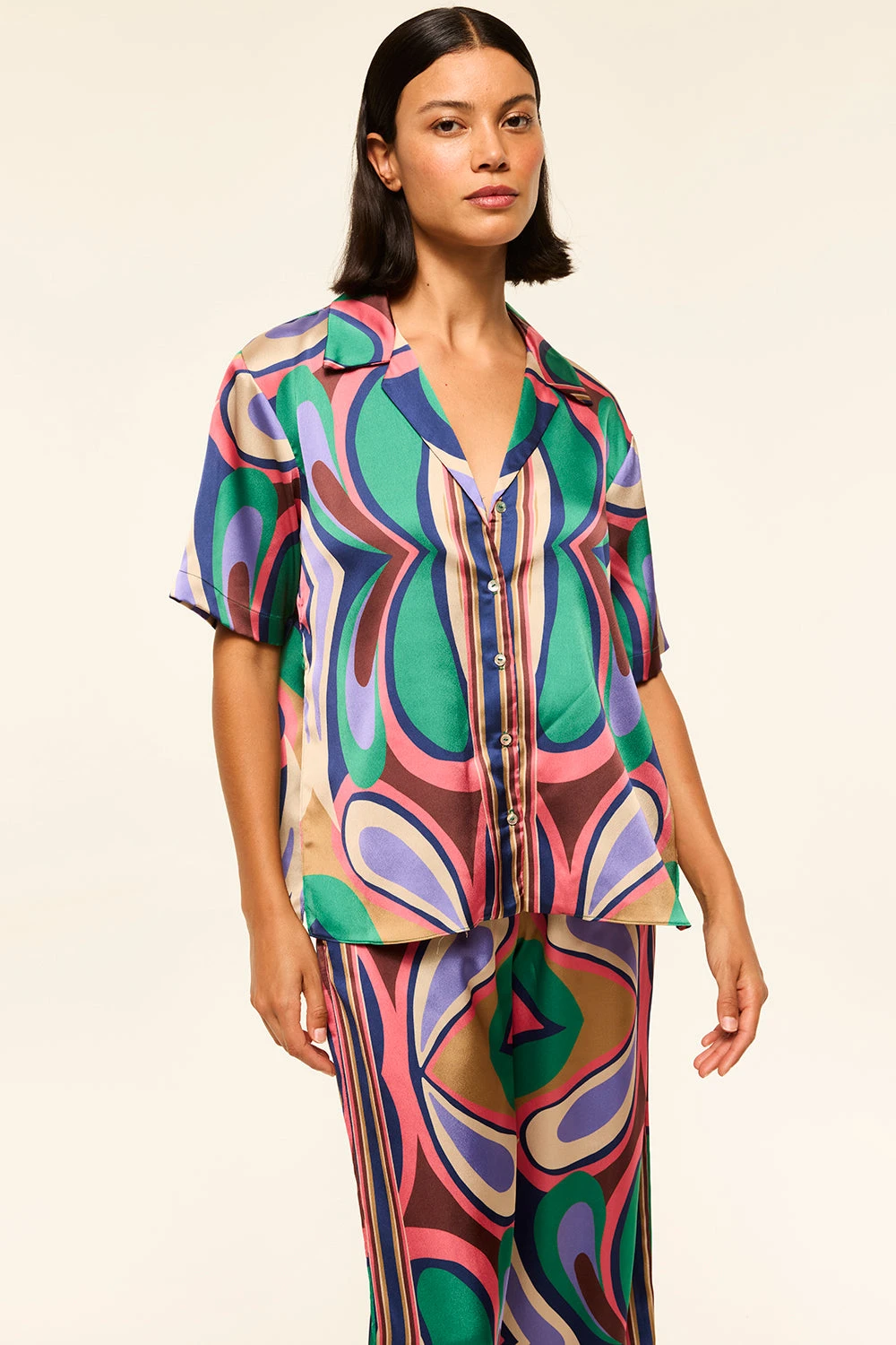 The Solange top is a feminine twist on the classic summary-down, cut from our silky Butterfly Mirror–printed satin. It features short sleeves, a fold-over collar, and a summary front. Pair it with the matching Elam short or Reshma pant for an easy, pulled-together set.