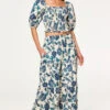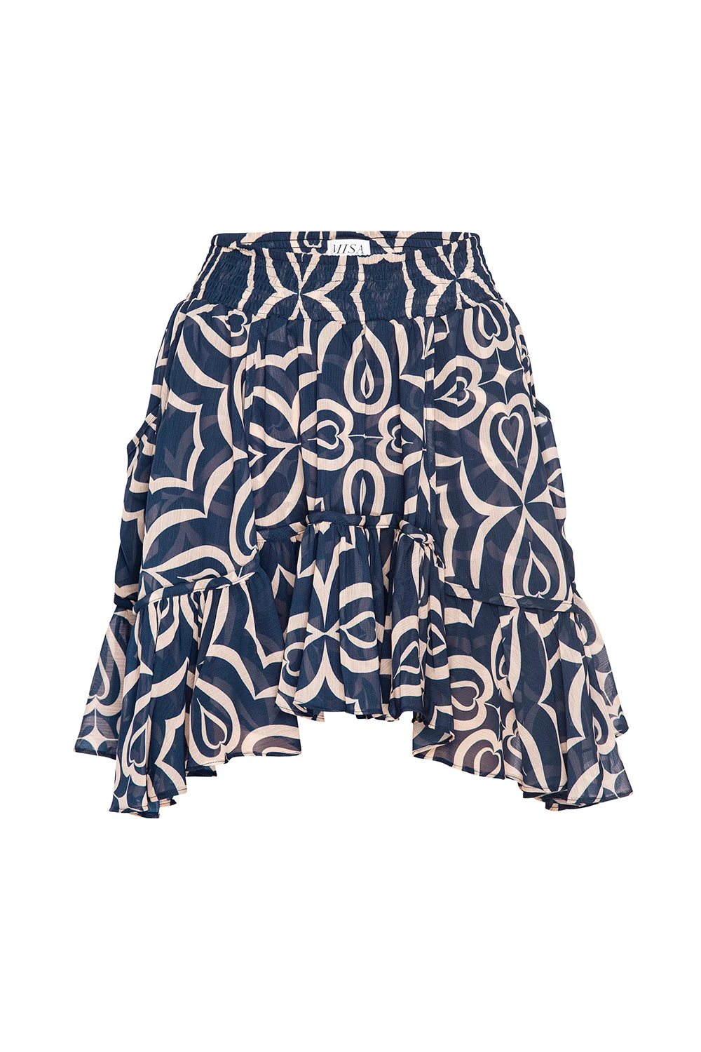 Soma is an easy mini silhouette cut from our Blue Mosaic Tile–printed chiffon. Designed with a wide smocked waistband, it flows into an airy skirt featuring an asymmetric ruffle hem and scoop pocket details. Pair it with a solid ribbed tank or the coordinating Bella top for a relaxed, put-together look.