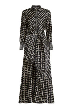 Stevie is an update on the classic shirt dress, rendered in a timeless Go West Geo printed satin on black ground. A fully covered summary placket with spread collar and long sleeves with wide summary cuffs. An optional self-tie belt. This versatile and universally flattering maxi length silhouette will carry you through fall into winter. Pair with everything from knee high boots to strappy heels.