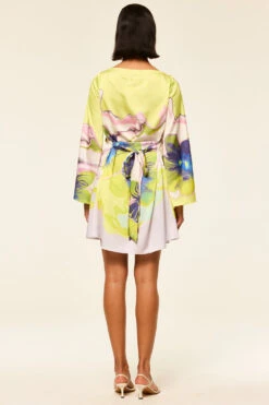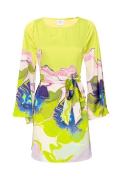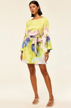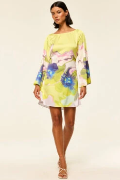 A chic update on a classic shift style, our best-selling Twiggy dress is a timeless mini silhouette cut from our vibrant new Marble Flora satin. A boat neckline leads into long bell sleeves and an adjustable tie waist. Remove the belt and pair with flats for an easy daytime look that seamlessly transitions to the perfect dinner look.