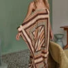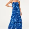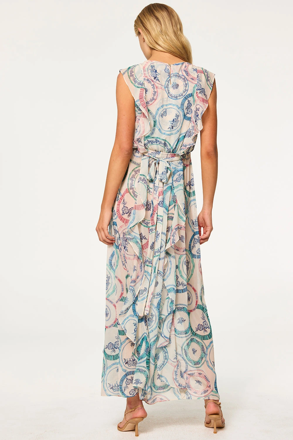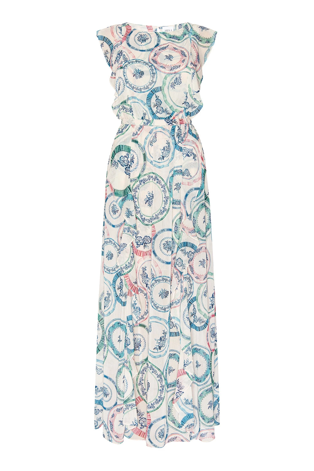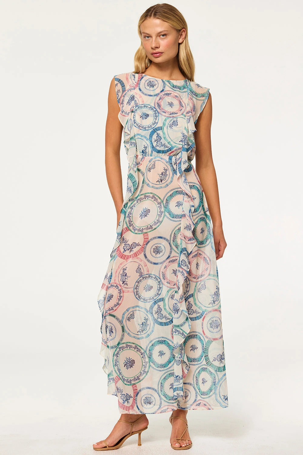 The Virginia dress is a flowing maxi silhouette cut from airy Prismatic Plates–printed chiffon. Double-lined for coverage, it features a high neckline and sleeveless bodice, fitted at the bust and trimmed with a cascading ruffle that extends to the skirt and hem. A gently pleated skirt flows from a defined waist, creating soft movement with every step. Optional self-tie belt. Finished with a hidden keyhole back closure, this style pairs effortlessly with flat sandals or can be dressed up with heels for any occasion.