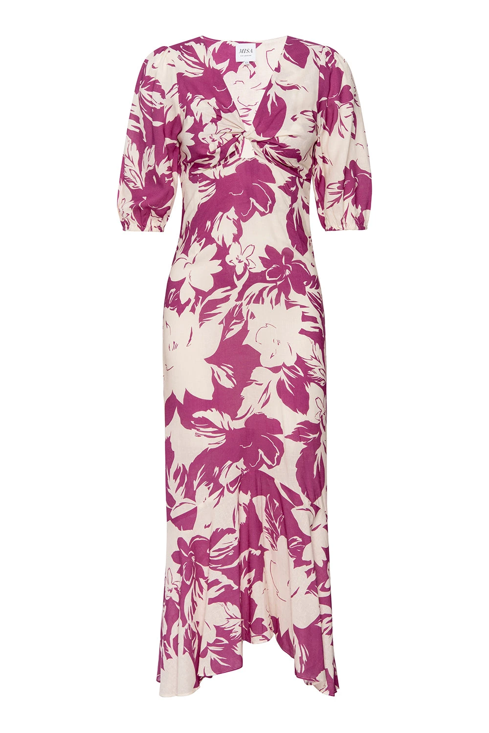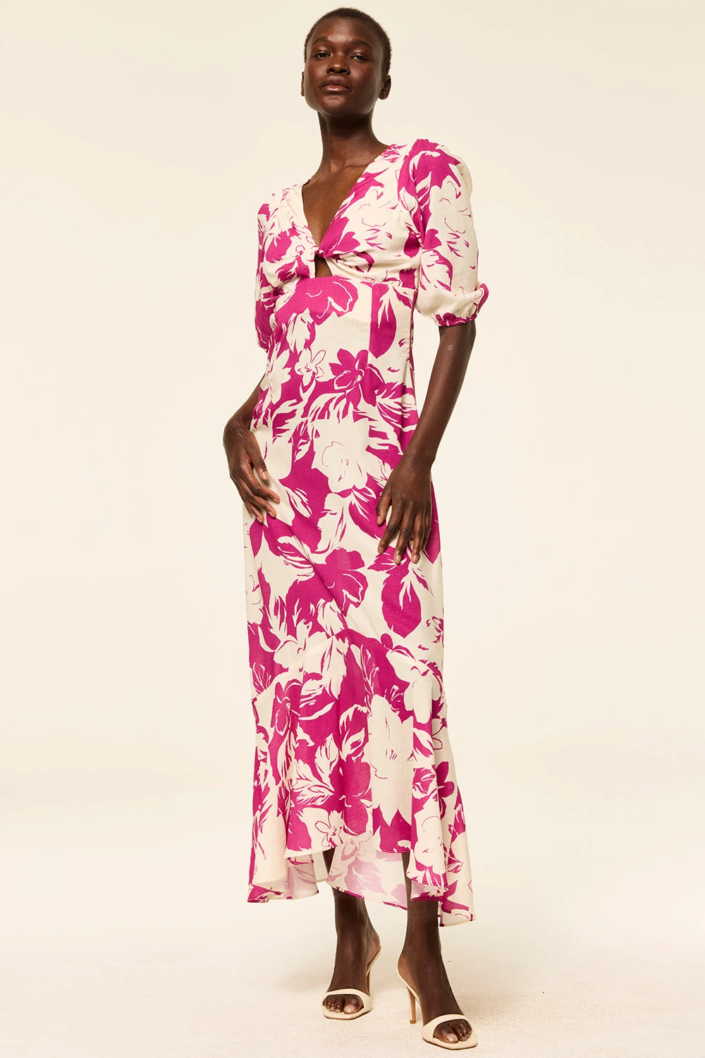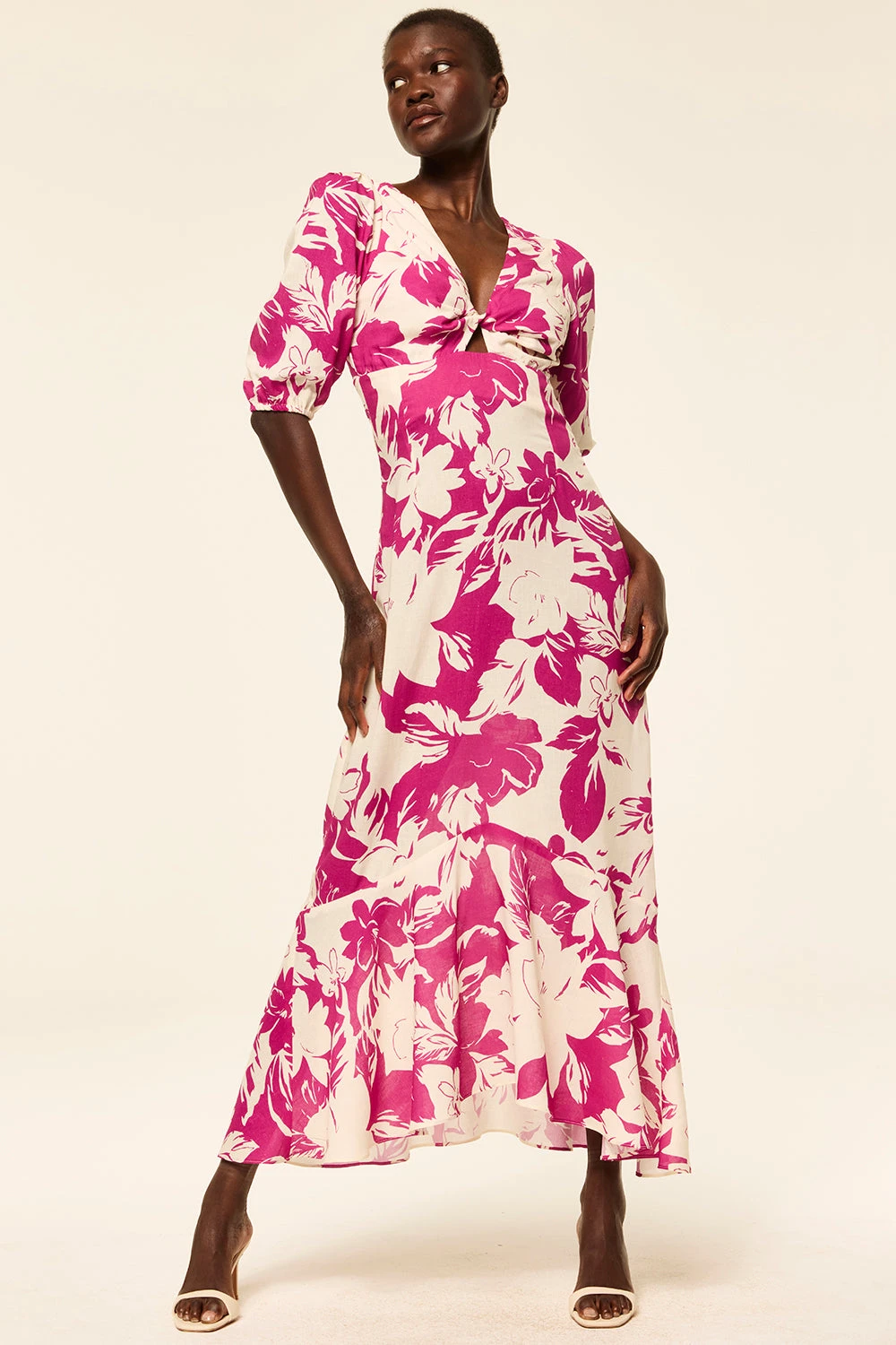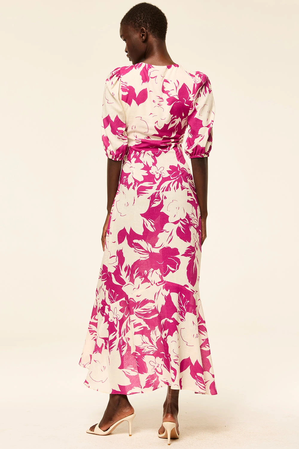 Wallis is a gorgeous midi dress cut from our linen Fuchsia Flora print. Featuring a V neckline, short puff sleeves and a twist front bodice with small cutout. This a-line silhouette has a side zip closure and handkerchief hem. Pair with everything from flats to strappy heels.
