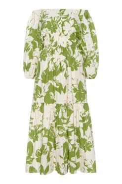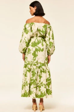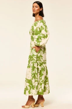 Our new Yasenia maxi is cut from a Green Goddess printed cotton poplin and features voluminous three-quarter sleeves with elastic cuffs. The elasticated neckline can be worn on or off-the-shoulder. Features a elasticized ruched waist detail and side slit pockets that lead into an ankle grazing wide ruffle hem. Dress this effortless and versatile wardrobe staple up with bold jewelry and heels or with flats for a chic daytime look.