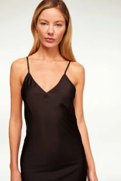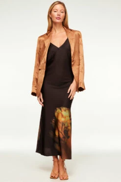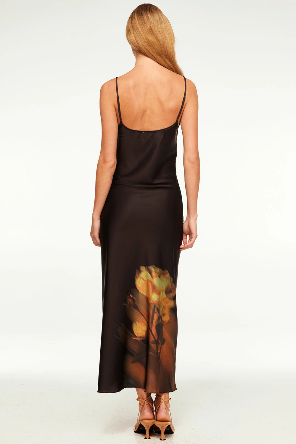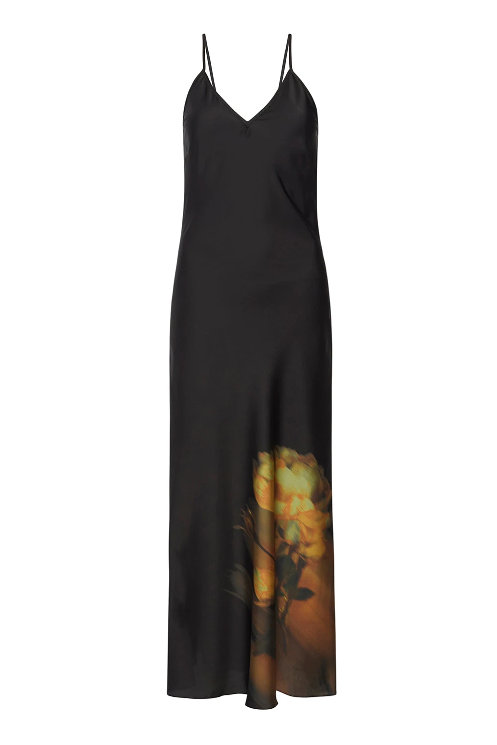 Zia is a classic bias cut slip dress silhouette in black satin with a yellow rose graphic printed at the hem. This effortless style features adjustable spaghetti straps and a v-neckline. Wear with our mesh Lula or Nadja top underneath for a chic fall style.